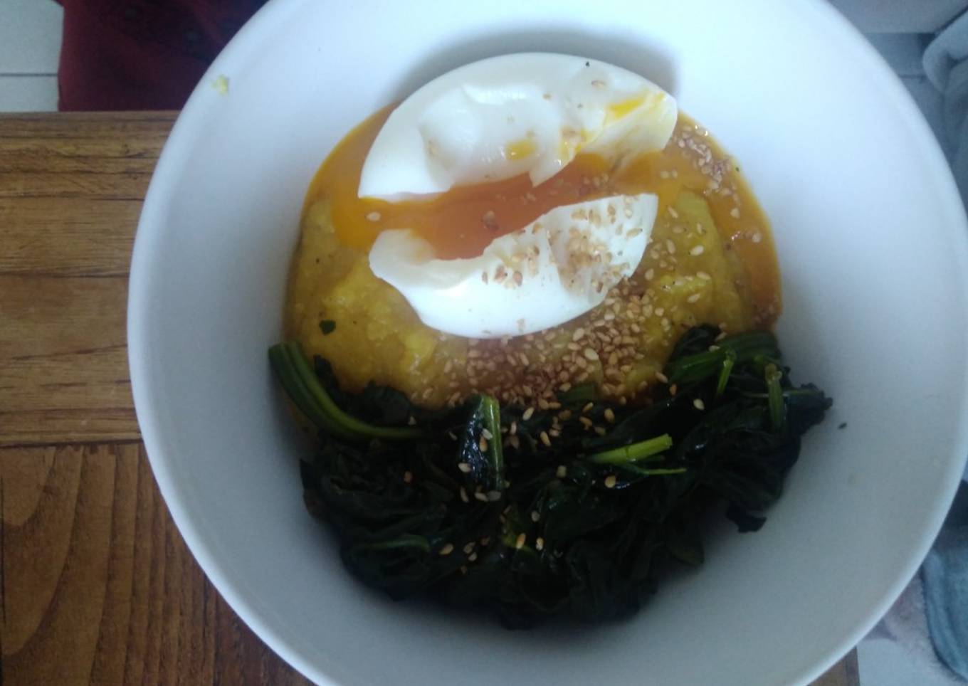 - Monter le plat dans un bol : polenta au fond, les épinards sur la moitié du bol et déposez l'oeuf poché a côté. A l'aide d'un couteau, ouvrez le pour déguster le jaune coulant. Saupoudrez de gomasio pour la déco !