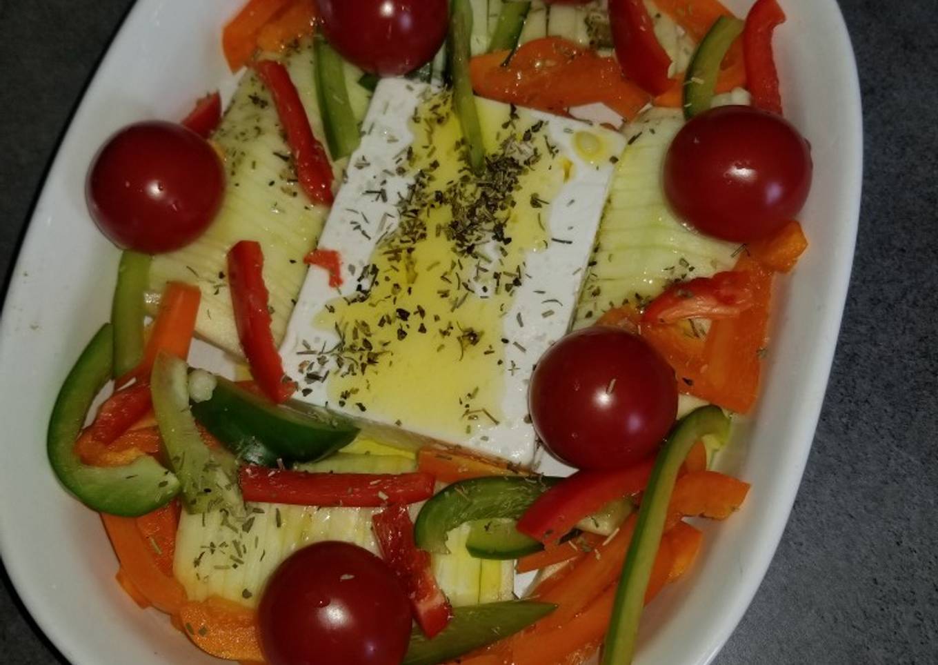 - Placer dans un plat, la feta, la courgette, poivrons, tomates, assaisonez selon vos envies moi j'ai mis sel huile olives herbes fe provence