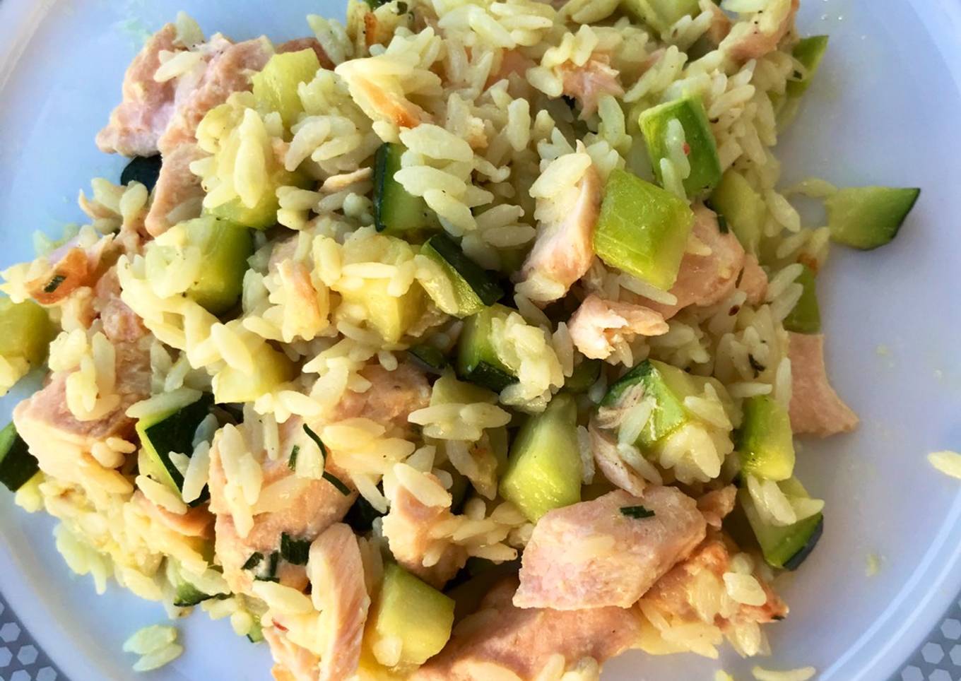 Poêlée de riz courgette saumon au lait de coco/ citron/ gingembre