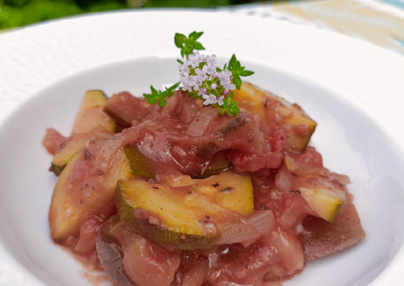 Émince ton oignon, presse tes deux gousses d'ail. - Dans une cocotte fais revenir dans de l'huile d'olive dans l'ordre: les oignons, ajoute la pulpe d'ail. Ajoute le thym et sel et poivre, remue, ajoute courgettes, tomates et aubergines, remue. Ajoute un peu d'eau et la sauce tomate, remue et laisse cuire à feu doux. Remue souvent.