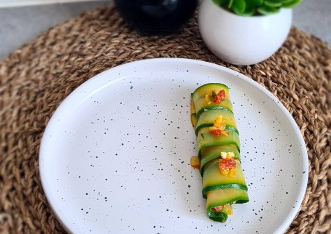 - Procédez au montage du cannelloni de courgette. Sur un film plastique ou sur une assiette placez les bandes de courgette en les superposant sur 1 cm. Placez la farce puis roulez les courgettes pour former un boudin..