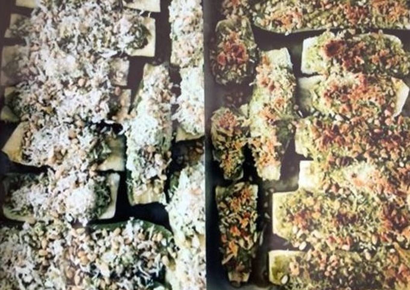 - Quand les courgettes sont cuites, disposez les dans un plat huilé. Garnissez les de la farce chèvre-pesto et parsemez du mélange chapelure-pignons.