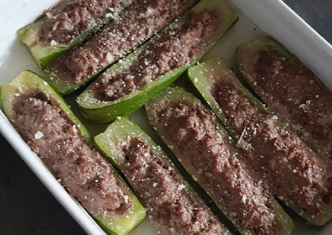 - Dans un plat allant au four verser 2 cuil. à soupe d'huile d'olive et y placer les courgettes. Dans une terrine mélanger la viande hachée, la cuil. d'huile restante, l'ail pilée, le sel et le poivre, farcissez les courgettes avec ce hachis.