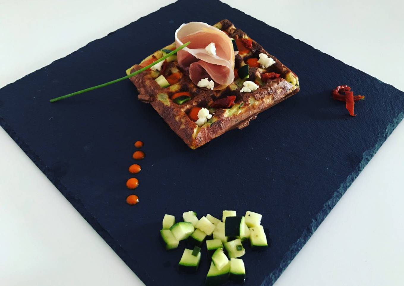 - En topping ce que vous voulez 😉 ici une crème de poivron, du jambon cru, quelques dés de courgette crus marinés au citron, et du chèvre émietté