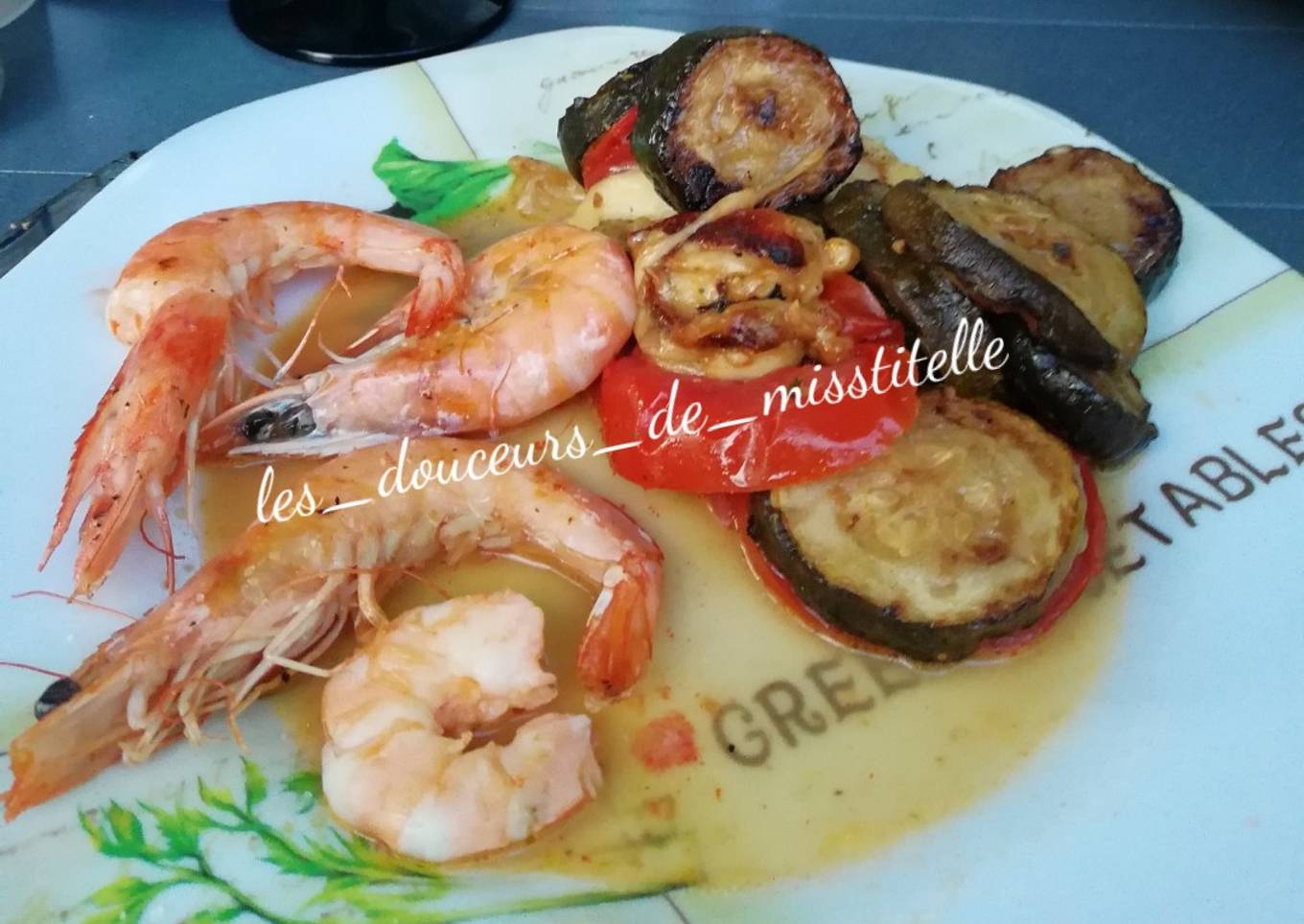 - Griller les scampis non décortiqués sur une plancha et servir avec les tomates courgettes gratinées.